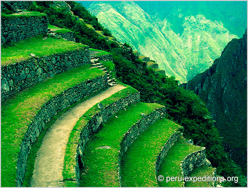 The day starts with the pass of Runkuracay (3900 m) where we see an Inca watchtower. Then we continue to the Inca ruins at Sayacmarca (a small maze like ruin built above a sheer cliff ) and, passing through a rock tunnel, we reach Phuyupatamarca ( City above the clouds) (3,600 mts), a beautiful set of linked stone baths still supplied by mountain streams. From this area, we should achieve views of Mt.Salkantay (6271 m), one of two most sacred peaks to the Incas. The descent down from the third pass (3600 m) is by a continuous set of steps (over 2300 of them), into cloud-forest, to our last campsite. From here a short walk takes us to the impressive ruins of Wiñaywayna (2600 m). The extra relaxation time provided here allows us to recoup our strength to make an early start the next day and maximize the experience of Machupicchu. We complete 7 hours.. Overnight Camp (B/L/D)