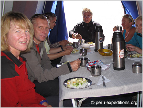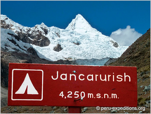 A short, scenic stage, amazing because of what is ahead - a beautiful view of Cruze Alpamayo, 4,250 m. Those who wish can climb to Alpamayo Base Camp North (4,500 m) and do an optional summit hike to Jatunjirca Peak (5030 m) allowing you to get above 5000 meters. Fantastic views of Alpamayo (5,947 m) and Quitaraju (6,036 m.) Alternative: Spend a half day resting in the Cruze Alpamayo Camp, with a beautiful view of Alpamayo. Overnight Camp (B/L/D)