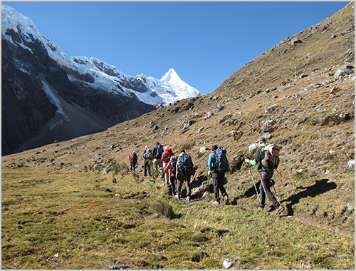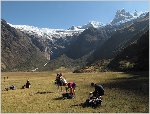 This will be a long and difficult day. We pass by the large nearby lake, Cullicocha, with fantastic views of the Santa Cruz peaks and glaciers, and continue to Osoruri Pass (4,860 m.) After a descent of 400 meters, we climb over Vientunan Pass (4,770 m) and finally drop sharply into the valley of Cedros Alpamayo (Alpamayo Cedars.) After this 8-9 hour day we reach Ruina Pampa Camp (4000 m.) Overnight Camp (B/L/D)