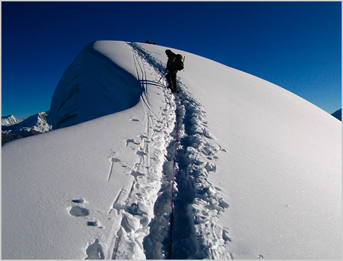 About Nevado Vallunaraju: The high peak of North Vallunaraju, at 5,686 meters, is close enough to Huaraz to do a summit trek in two days via a moderate climb. Setting out for this peak, you can see other peaks of the northern part of the Cordillera Blanca, including Oxshapalca (5,881 m) and Ranrapalca (6,262 m.) From the summit of Vallunaraju there is a beautiful view of the city of Huaraz and the Callejón de Huaylas (the central area of the valley between the Cordilleras Blanca and Negra.) Between North and South Villunaraju, there are 5 routes via different walls. The first ascent was to the North peak in 1949 via what has come to be called the “normal route“, which is what this trek follows as well. It‘s also a good place to practice ski mountaineering.