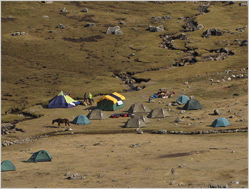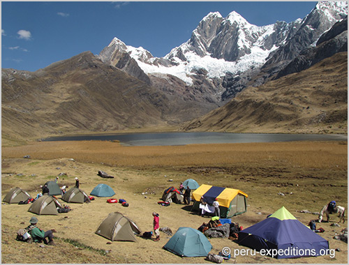 At times the climb is steep and strenuous, under the steep glaciated cliffs of the high massif of Raju Collota to Punta Tapush Pass. Once again, magnificent views, including Nevado Diablo Mudo (Silent Devil) (5,350 m), tomorrow’s destination for the ambitious and physically strong climbers among us. Short descent from the pass north to Susococha Lake (4,600 m) and a little farther to Cashgapampa Camp (4500 m). Overnight Camp (B/L/D)